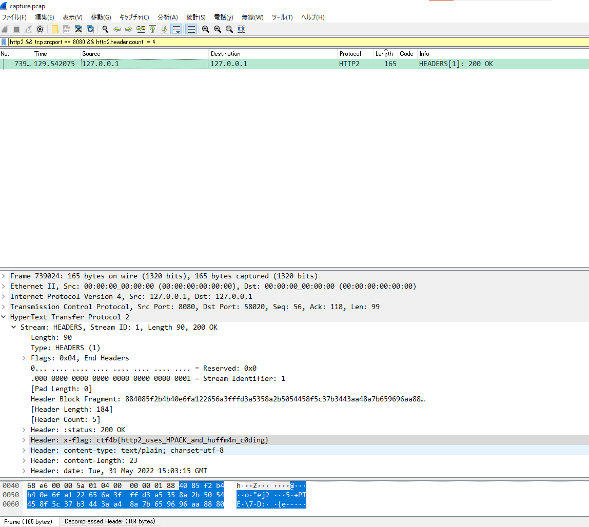 大量のパケットの中身はほとんど似通った内容であるため、通常のパケットのヘッダの数とは違うパケットをフィルタしたらフラグが出てきた。