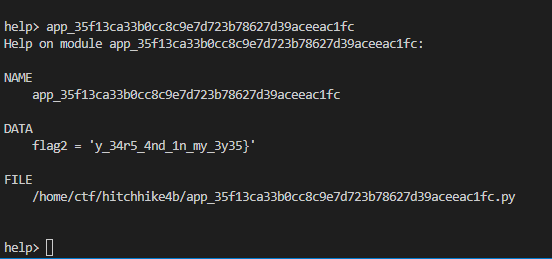 色々調べているとhelp()ではモジュールの中身を見れるらしいということで、__main__をみたらflag1をゲット。