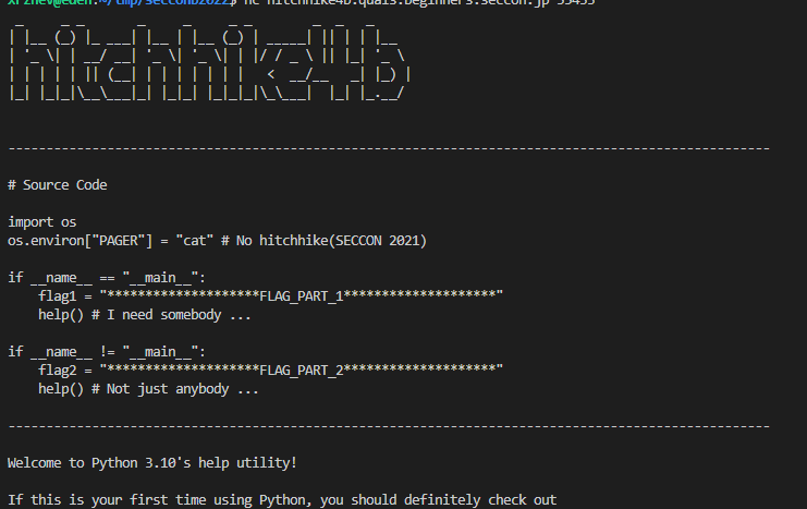 pythonのhelp()関数からどうにかして2つに分けられたフラグを引っ張ってくる問題。help()関数では通常、ヘルプビューワとしてlessを使っているため、そのままシェルをキックできる。