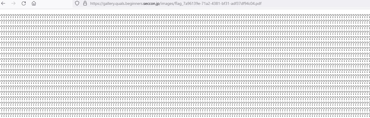 2curl https://gallery.quals.beginners.seccon.jp/images/flag_7a96139e-71a2-4381-bf31-adf37df94c04.pdf -i -H "Range: bytes=10001-20000" -o 2.pdf_chunk